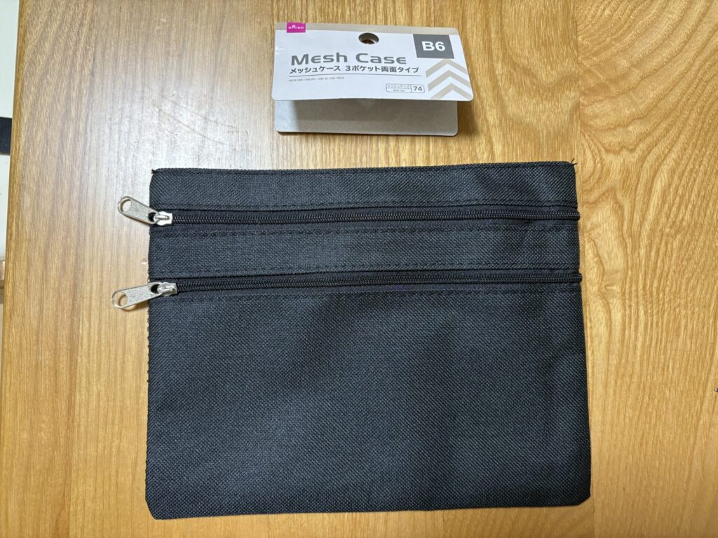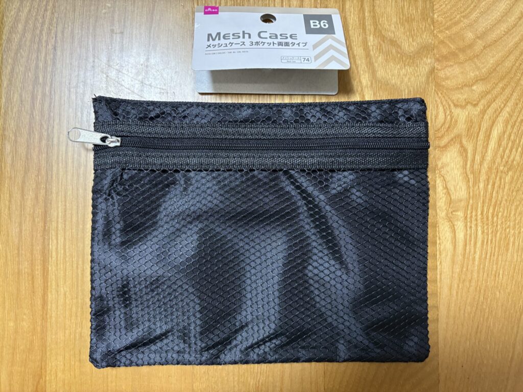 どんなポーチがいいか悩んだのですが、ダイソーの「メッシュケース 3ポケット両面タイプ」を購入。